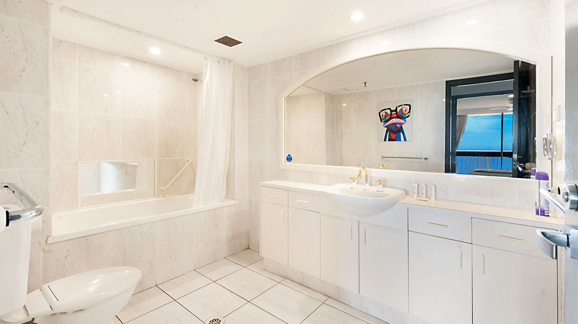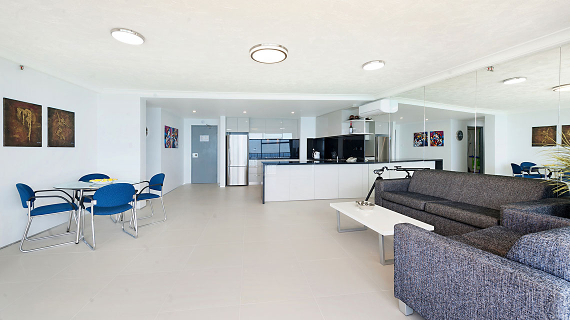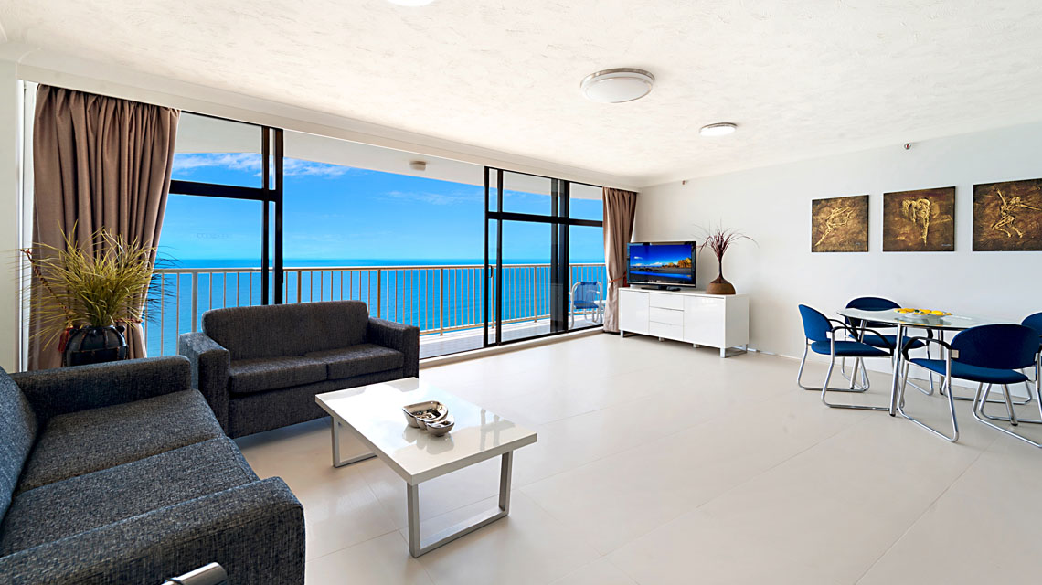 Absolute beachfront apartment, with sensational views of beach, ocean, river and city, from wrap around balcony off the living area. Perfect spot for beach holiday.