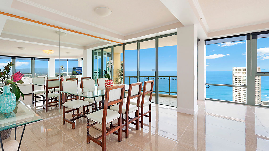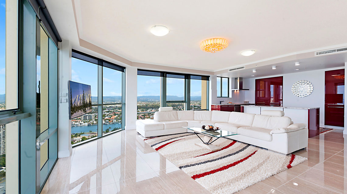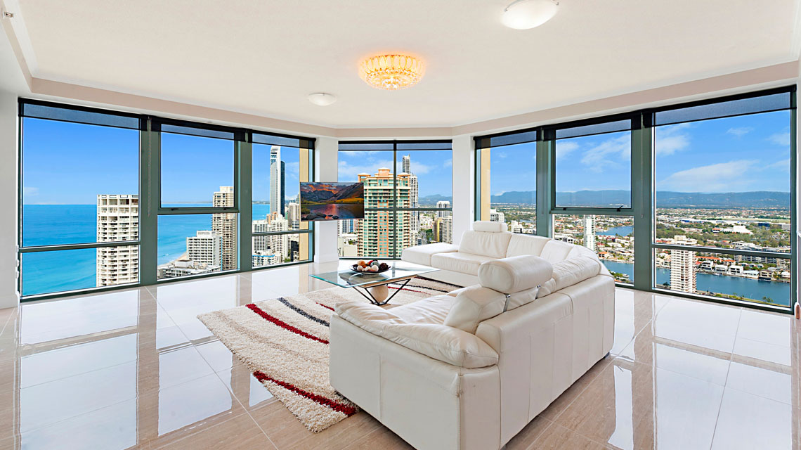 Sprawling over 210 m2 with 3 oversized king bedrooms, the apartment captures 330 degrees of stunning uninterrupted views of the Pacific Ocean, Coolangatta-Twin Water coast, Surfers Paradise city skyline, Tamborine Mountain hinterland, Nerang River, and all the way down to Paradise Waters and beyond. Imagine being able to watch the sun rise from the ocean horizon as well as the sun set behind the mountains, all whilst sitting right in your own lounge room. It is perfect for all the family and their friends who want to enjoy the ultimate 5-star luxury at an affordable price.