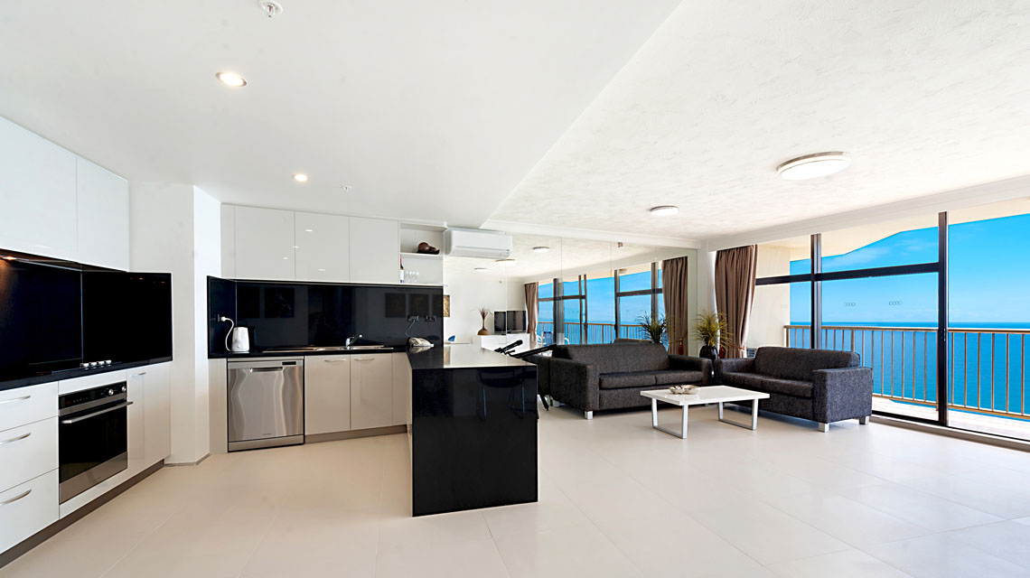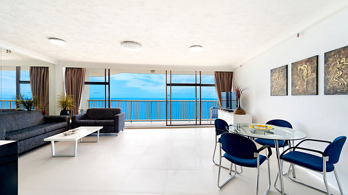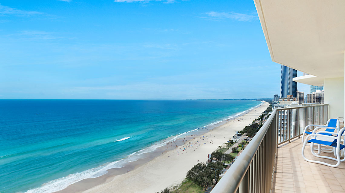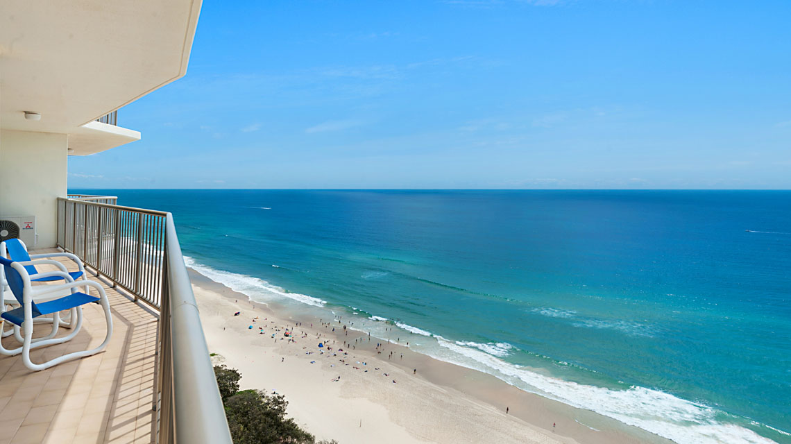 Absolute beachfront apartment, with sensational views of beach, ocean, river and city, from wrap around balcony off the living area. Perfect spot for beach holiday.